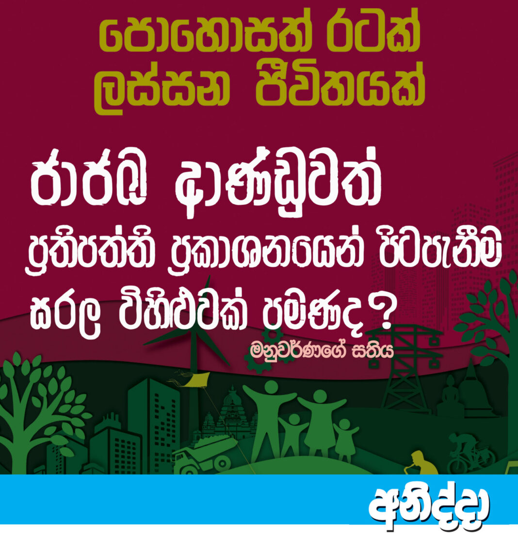 එහෙත් දැන් සිදුවී තිබෙන්නේ කුමක්ද? ජාජබ ආණ්ඩුව, බලයට පත්ව අවුරුදු එකහමාරක් ගතවන විට, මහජනතාවට පොරොන්දුවූ දේවල් කොපමණ ඉටුකර තිබේද? මේ දවස්වල මහජනතාව අතර තිබෙන පොදු මතය වන්නේ, ජාජබ ආණ්ඩුව කරමින් සිටින්නේ සිය ‘ලස්සන රටක්- පොහොසත් ජීවිතයක්’ නමින් යුත් ප්රතිපත්ති ප්රකාශනයේ සඳහන් දේවල් නොවේය යන්නයි. ඒවා එකින් එක වෙන වෙනම විස්තරාත්මකව දැක්වීම අවශ්ය නොවන්නේ, ප්රතිපත්ති ප්රකාශනයෙන් පීලිපැනීම් විශාල ප්රමාණයක් දකින්නට ලැබෙන නිසාය. ඒ පිළිබඳව මහජනතාව තුළ විශාල දැනුමක්ද තිබෙන නිසාය. අනෙක් අතට, කතා කළ යුතු වැදගත් කරුණ එය නොවන නිසාය.